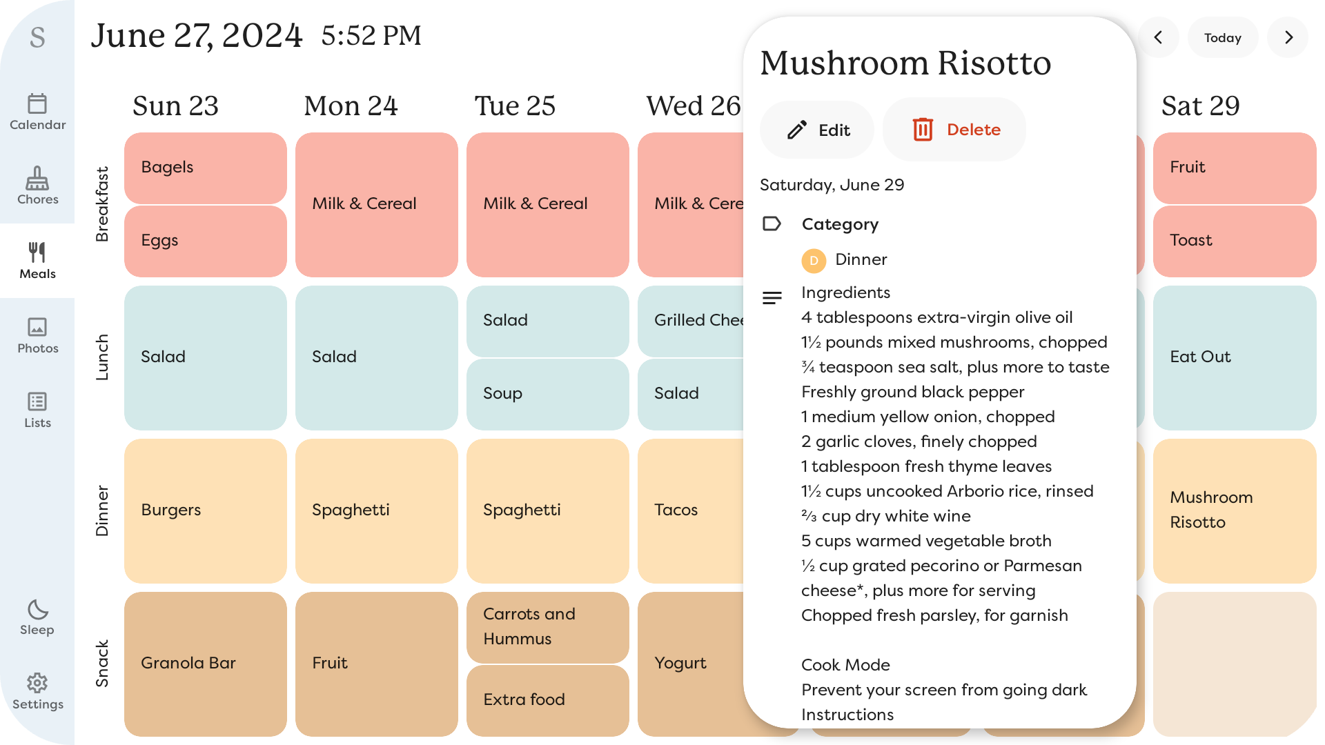 In addition to planning out an entire week's worth of meals, you can also store your entire recipes for each meal on your Skylight Calendar. Viewable on both the Skylight App and the Calendar, you can check for ingredients you may need while you're at the store, or even pull up the full recipe while cooking.