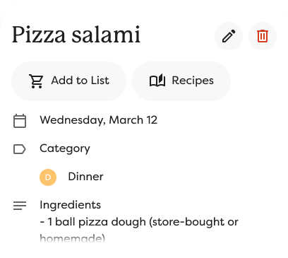 With the meals tab, you can plan your family’s meals for the next seven days. Everyone will be able to check the meal plan, and meals will display in the calendar in the Schedule view.