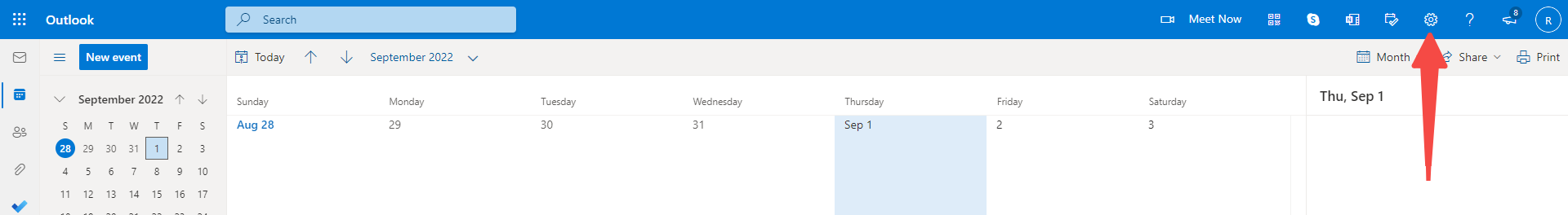 - Access your Outlook Calendar in your web browser and select the Settings gear icon in the upper-right-hand corner.